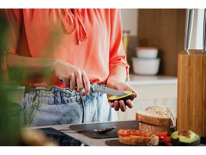 Dieses Universalmesser von Berghoff ist aus hochwertigem rostfreiem Stahl gefertigt, der nicht nur lange scharf bleibt, sondern auch sehr leicht zu pflegen ist. Dieses statische Universalmesser hat einen nahtlosen Übergang von der Edelstahlklinge zum passenden Edelstahlgriff. Der Hohlgriff bietet Ihnen einen komfortablen und sicheren Griff. Dieses Messer ist Teil eines «Alles in Einem» Messerblocks mit integriertem Messerschärfer und dazugehörigen Schneidebrettern.