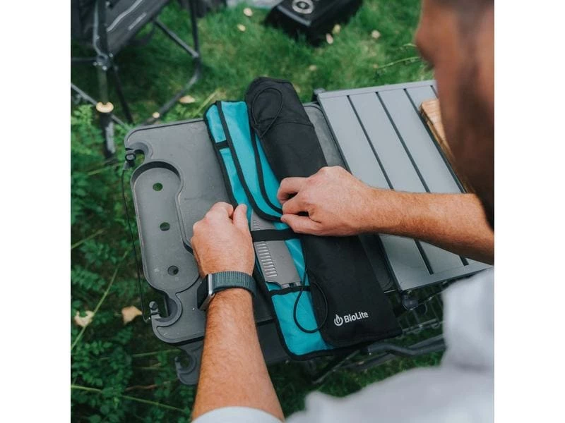 Faltbares Werkzeugetui zum Kochen und Grillen mit Feuer. Das extra lange Design bietet einen angenehmen Abstand zu Flammen und Hitze, während die aufrollbare Organisationsmatte alles in Ordnung hält. Hergestellt aus strapazierfähigem und rostfreiem Edelstahl in Lebensmittelqualität. Verwenden Sie es mit dem BioLite FirePit, BioLite CampStove oder einem Outdoor-Kocherlebnis Ihrer Wahl.