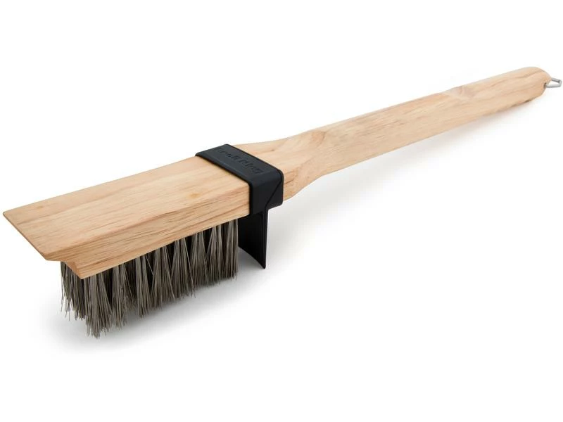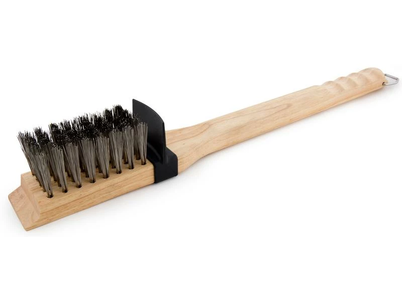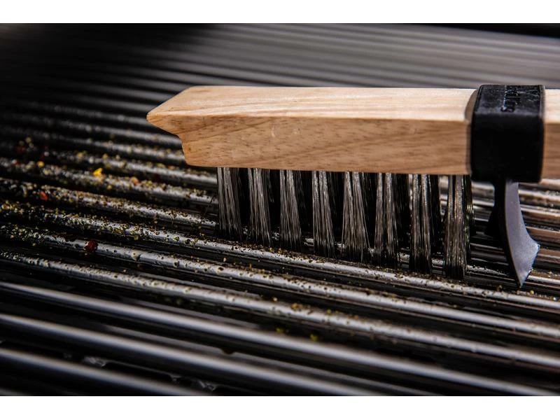 Die massive Bürste ist besonders strapazierfähig und reinigt durch ihre Länge auch sehr gut die Rost Zwischenräume. Ein Spritzschutz verhindert beim Bürsten, dass Schmutz und Abrieb in Richtung des Anwenders geschleudert werden. Zusätzlich verfügt die Grillbürste über einen Holzschaber am Ende des Bürstenkopfes.