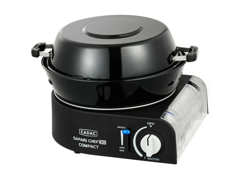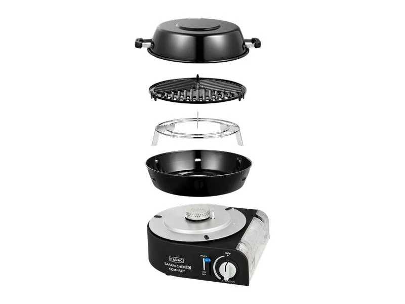 Der Safari Chef 30 Compact ist ein ultrakompakter, leichter Gasgrill. Dieser Grill arbeitet direkt mit einer 227gr-Bajonettkartusche; einfach die Gaskartusche in das Gerät einsetzen, einklicken und schon kann man mit dem Kochen oder Grillen beginnen. Ein ideales Gerät für Outdoor-Aktivitäten und Campingurlaube. Trotz seiner geringen Grösse ist der Safari Chef 30 Compact äusserst vielseitig, da er über verschiedene Kochflächen verfügt: einen Topständer, ein Grillrost und einen Deckel, der auch als Topf genutzt werden kann. Auf dem Topfständer kannst du problemlos einen Topf mit Suppe oder Nudeln kochen. Der Grillrost ist mit der GreenGrill-Beschichtung von CADAC versehen und eignen sich perfekt zum Braten und Grillen von Fleisch, Fisch und Gemüse. Der Deckel kann auch als (Suppen-)Topf verwendet werden und ist somit multifunktional. Die Tropfschale fängt Kochrückstände auf, wenn du den Grillrost benutzt, dient aber auch als Windschutz, damit der Brenner nicht ausbläst.
