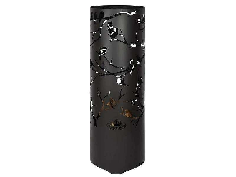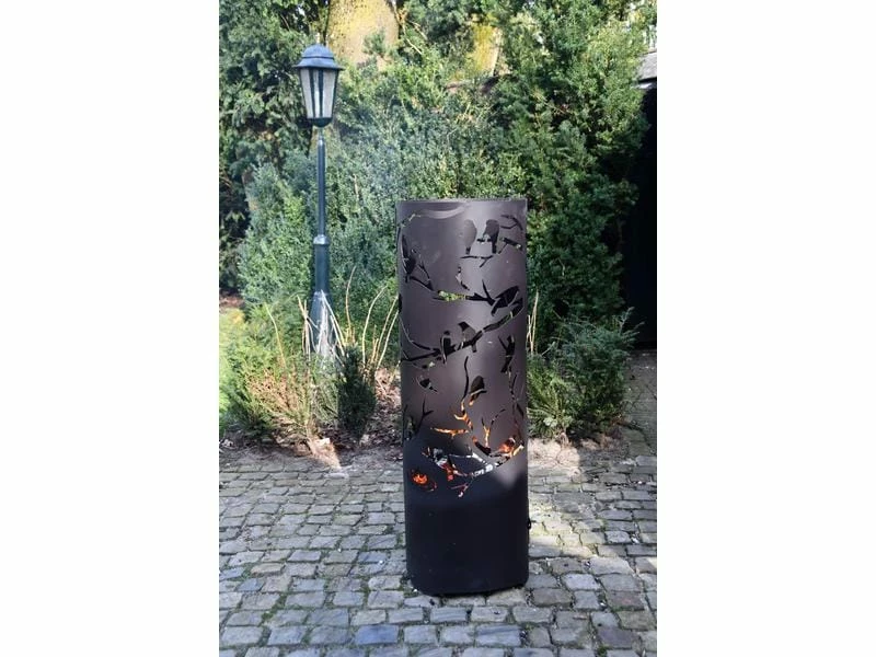 Diese Feuertonne ist ein Blickfang in jedem Garten. Die lasergeschnittenen Vögel auf einem Ast erzeugen einen bezaubernden Effekt.
