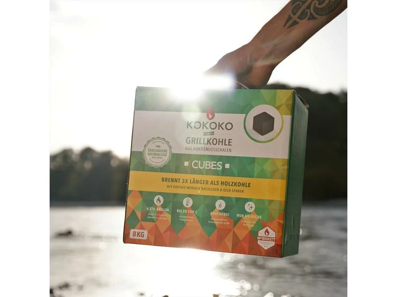 Die KOKOKO CUBES von McBrikett sind in Würfelform gepresste Kokosnussschalenbriketts (4 x 4 x 4 cm). Sie sind ideal geeignet z.B. für Longjobs / für die Low & Slow Methode im Kugelgrill (z.B. mit Minion Ring), auch für Keramikgrills oder für den Dutch Oven. Durch die Würfelform gibt es mehr Auflagefläche auf dem Topf und eine bessere Wärmeverteilung, es sind bis zu 50% weniger Briketts erforderlich. KOKOKO CUBES ist die Holzkohle für Profis! Sie ist darauf ausgelegt, so heiss wie möglich und so lange wie möglich zu glühen. Das ist perfekt für alle Grillmeister, die gerne grillen und es gerne länger aushalten. Die KOKOKO CUBES sind auch ideal für Spareribs, Pulled Pork, usw. Die Würfel sind in praktischen rechteckigen Boxen verpackt. Dadurch lassen sie sich leicht stapeln und transportieren, auch in kleinen Räumen. Wenn Sie mit dem Grillen schneller fertig sind und die Kohle noch glüht, können Sie die KOKOKO CUBES problemlos löschen und beim nächsten Grillen wieder verwenden. Sie löschen sie einfach mit Sand oder vorsichtig mit Wasser (tauchen Sie die Briketts mit einer Zange einzeln kurz in das Wasser).