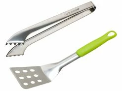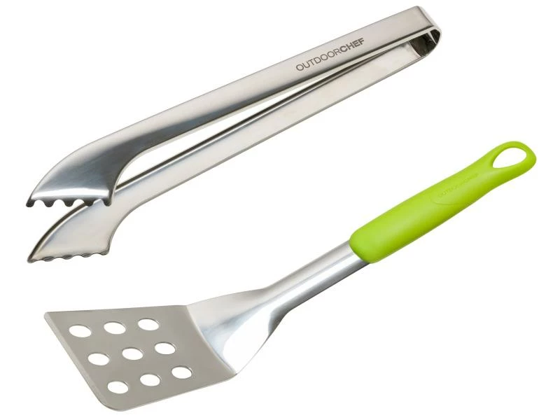 Das Besteckset Starter von Outdoorchef gehört zur Grundausstattung beim Grillieren. Das Set beinhaltet eine Grillzange und einen Wender, die für leichtes Arbeiten neben und auf dem Grill über einen langen Schaft und eine abgewinkelte Form verfügen. Der Wender besitzt eine abgerundete und eine Eckkante. Die Bestecke sind aus hochwertigem und geschmacksneutralem Edelstahl gefertigt.