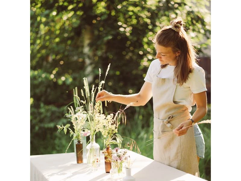 Die Schürzen sind aus 100% reinen Leinen in Europa hergestellt. Die Stoffe werden in Litauen und den umliegenden Ländern gewebt. Veredelung, Nähen und alle weiteren Prozesse werden innerhalb von 100 km durchgeführt. Das bedeutet, dass während des Transports der Produktion so wenig CO2 wie möglich ausgestossen wird. Zudem benötigt die Herstellung 5 mal weniger Pestizide oder Dünger im Vergleich zu Baumwolle.