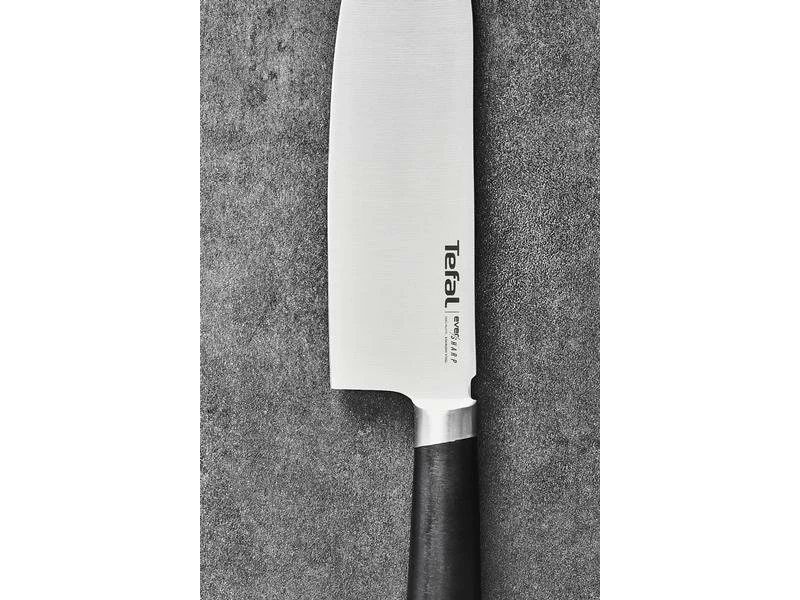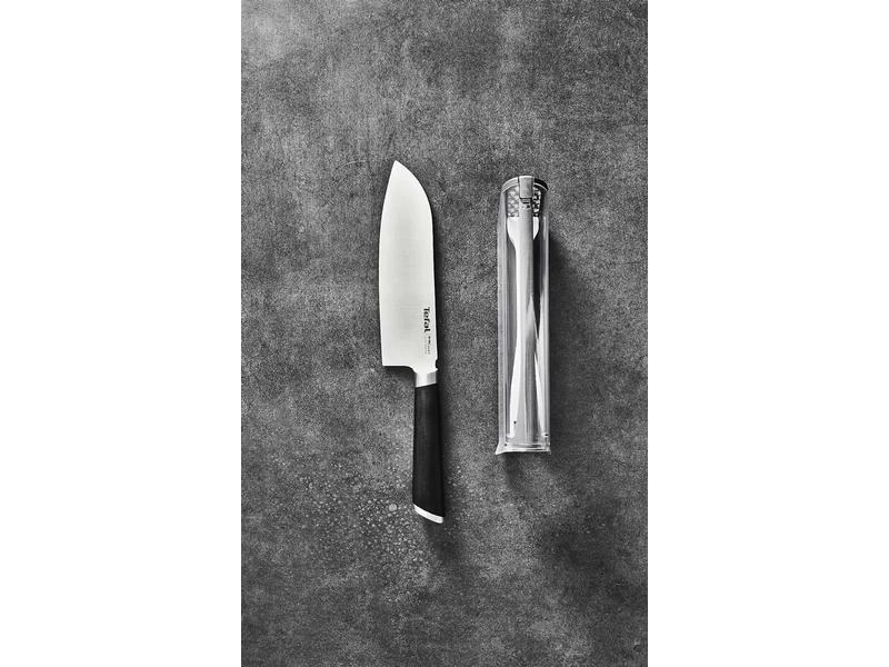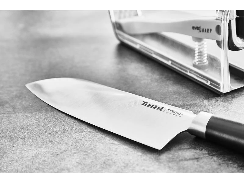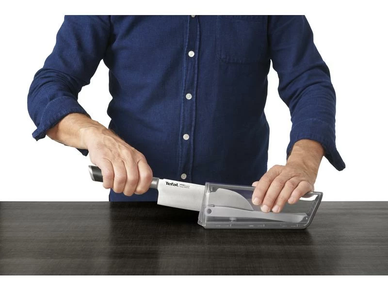Ever Sharp von Tefal ist die sicherste und innovativste Lösung zum Schneiden und Nachschärfen. Dank der exklusiven Schleiftechnologie* der Abdeckung des Küchenmessers, wird die Klinge automatisch im richtigen Winkel und nach jedem Gebrauch geschärft. Durch das integrierte Verschlusssystem bleibt das Messer fest verschlossen und wird erst wieder geöffnet, wenn Sie es auf den Griff nach unten drücken. Dieses vielseitige Chef-Messer einer Länge von 16.5 cm aus deutschem Edelstahl ist besonders langlebig und lässt beim täglichen Zubereiten von Gerichten keine Wünsche offen. Dank des beeindruckenden Designs kann Ever Sharp auf jeder Arbeitsfläche aufgestellt werden. *Patent angemeldet