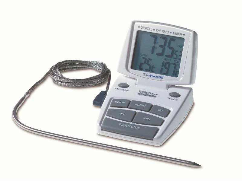 Der elektronische Küchen-Thermo-Timer von TFA kann ideal als Bratenthermometer zur Temperaturkontrolle im Backofen genutzt werden. Das vorhandene 1 Meter lange, hitzebeständige Kabel kann ganz einfach mit der Edelstahlsonde in den Braten gesteckt werden. Damit der Braten auch sicher gelingt, kann eine Ober- und eine Untergrenze angegeben werden, wobei der Alarm abgeht, wenn eine dieser Grenzen erreicht wurde.