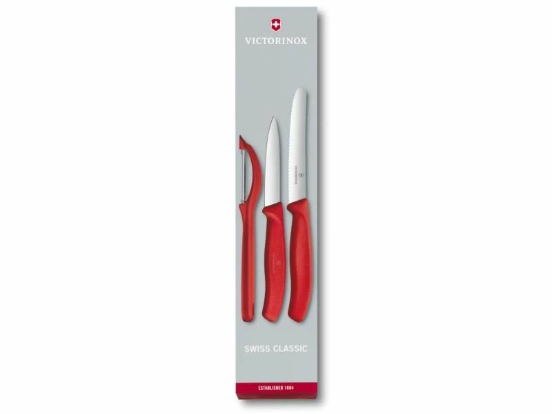 Mit dem Gemüsemesser-Set von Victorinox geht das Schälen, Schneiden und Würfeln von Obst und Gemüse leicht von der Hand. Dieses dreiteilige Set umfasst einen Universalschäler mit Zackenschliff und zwei verschiedene Messer, um eine gute Kombination für eine Basisausstattung Ihrer Küche zu bieten. Das Tomatenmesser mit Wellenschliff eignet sich besonders zum Schneiden von zähen Schalen. Das zweite Messer verfügt über ein spitz zulaufendes Ende, das zum Herauslösen unerwünschter Stellen in Obst und Gemüse nützlich ist.