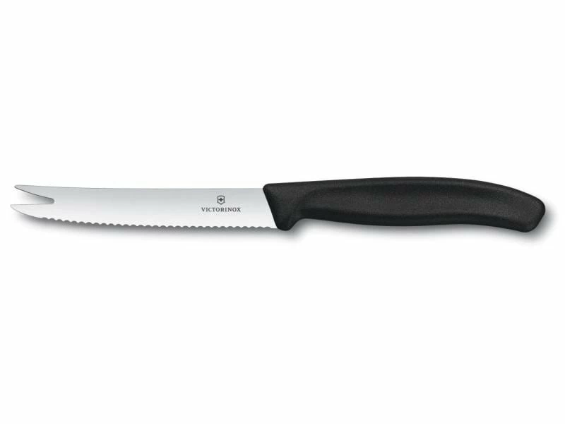 Das Classic Käse- und Wurstmesser von Victorinox eignet sich besonders zum Schneiden und Servieren von halbharten und harten Käsen, Salamis oder anderen Dauerwürsten. Dank des scharfen Wellenschliffs können auch harte Käserinden und die zähe Haut einer Wurst gleichmäßig und sauber geschnitten werden. Die portionierten Scheiben und Stücke können Sie mit der Gabelspitze aufnehmen und auf einem Teller drapieren oder direkt servieren. Durch den ergonomisch geformten Griff liegt das Messer gut in der Hand und lässt sich leicht führen.