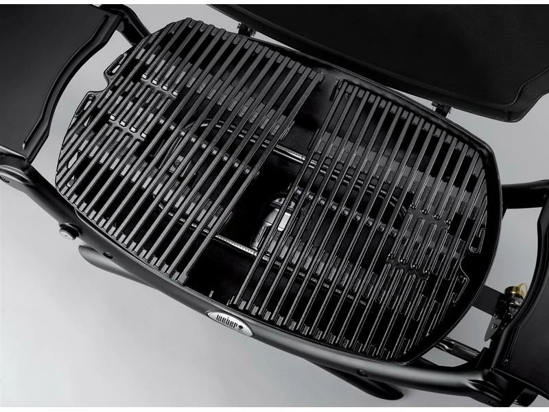 Der Q 2000 aus dem Hause Weber ist ein mobiler Gasgrill mit einer Rostfläche von 54 x 39 cm. Der zweiteilige Grillrost ist aus Gusseisen gefertigt, mit Porzellanemaillie überzogen und verfügt über eine Fettauffangschale. Der Rahmen ist aus robustem und zugleich leichtem glasfaserverstärktem Nylon gefertigt. Dank der Seitentische haben Sie alle notwendigen Geräte und Zutaten stets griffbereit.