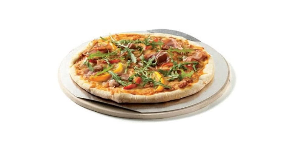 Der runde Pizzastein von Weber hat einen Durchmesser von 26 Zentimetern und wiegt 1,2 Kilogramm. Er eignet sich zum Backen von Pizza, Brot und Desserts mit allen Holzkohlegrills ab 47 cm und Gasgrills ab Weber Q 100/1000.