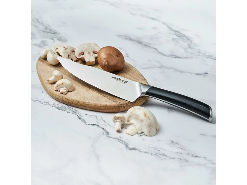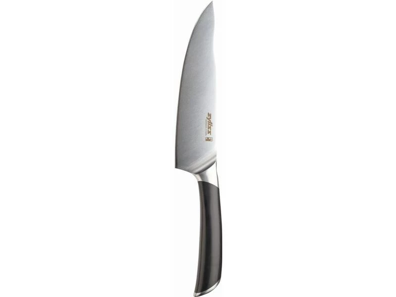 Handliches Kochmesser mit breiter Klinge und ausgeprägter Klingenbiegung für die perfekte Wiegetechnik beim Schneiden.
